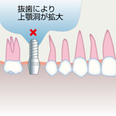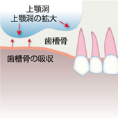 歯がなくなると、失った歯の周囲から歯槽骨の吸収がはじまります。上顎の場含は、図のように上顎洞の拡大も進行する可能性もあり、歯槽骨は加速的に薄くなります。