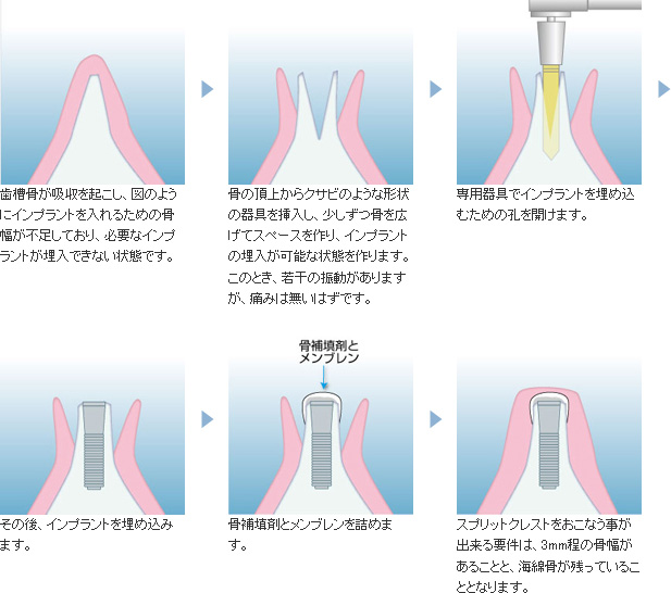 歯槽骨が吸収をおこしている状態で、骨の高さには問題ないのですが、インプラントを埋入するための骨幅が足りない場合におこなわれる治療方法です。