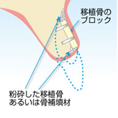 歯槽骨が吸収した部分に移植骨のプ□ツクを設置し、周囲の間隙に粉砕した移植骨あるいは骨補填材を詰めます。 移植骨プ□ツクは、動かないようにスクリューで固定します。スクリューはインプラント体と同じチタンを使用します。このスクリューは移植骨と歯槽骨が同化した段階で除去します。